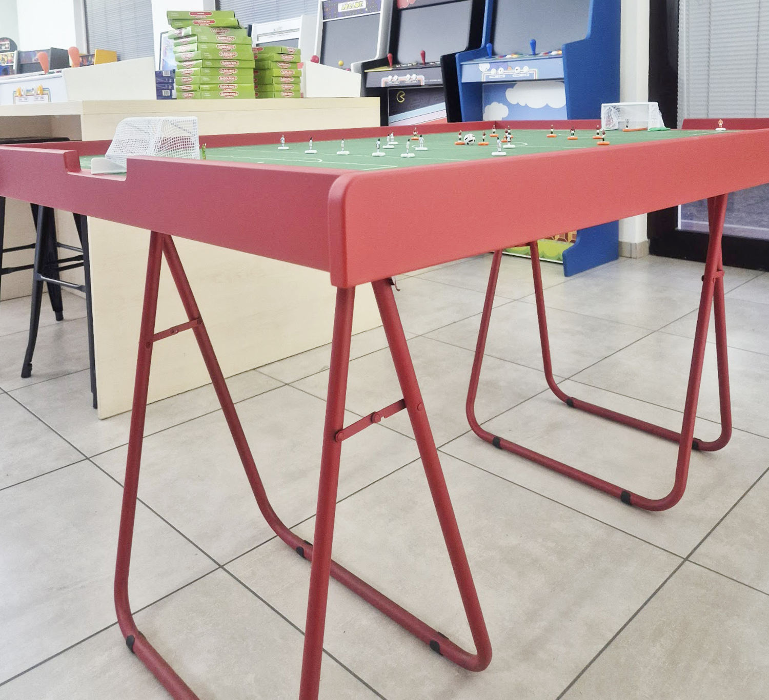 Tavoli Nuovi da Subbuteo. Struttura in legno laccato, con colori a scelta. Supporto cavalletto in vari colori (opzionale)
